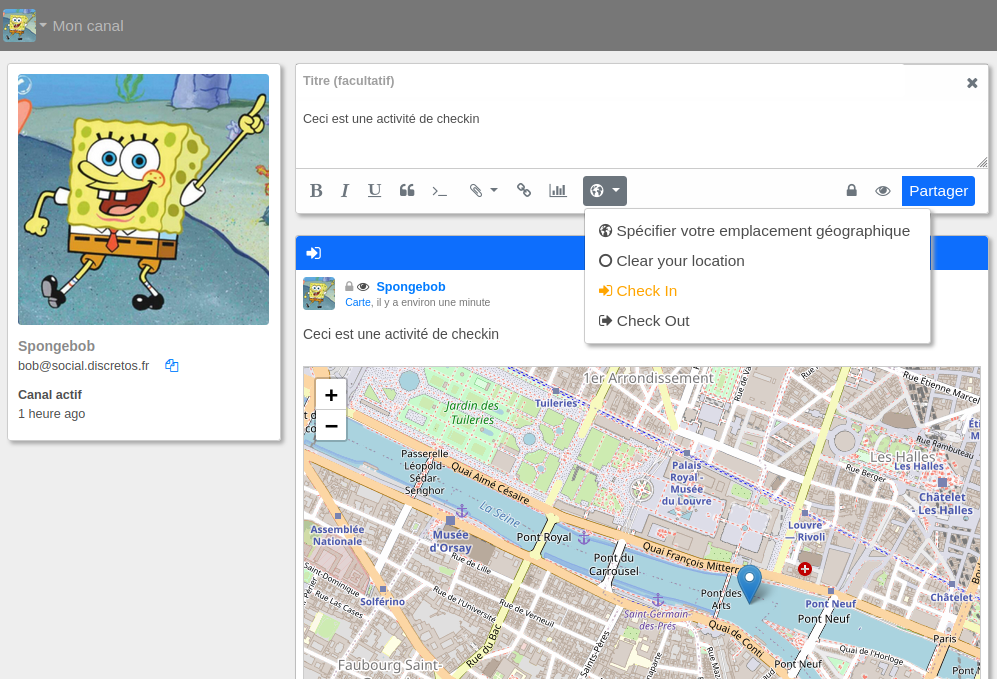 3. Les deux boutons suivants s'affichent si une position géographique est incluse dans la publication. Il s'agit des icônes "entrer" et "quitter", qui permettent de transformer la publication actuelle en une activité en ligne "arrivée" (checkin) ou "départ" (checkout). Lorsque l'une de ces options est sélectionnée, l'icône change de couleur pour indiquer que le message est désormais une activité d'arrivée/départ et une carte est insérée dans le message. Vous pouvez ajouter du texte supplémentaire ou tout autre contenu. Utilisez le bouton de prévisualisation (icône "œil") pour visualiser les résultats sans les publier ou cliquez sur "Partager" pour publier. Si vous cliquez une deuxième fois sur l'un de ces deux boutons, l'action est annulée et le message redevient un message normal.