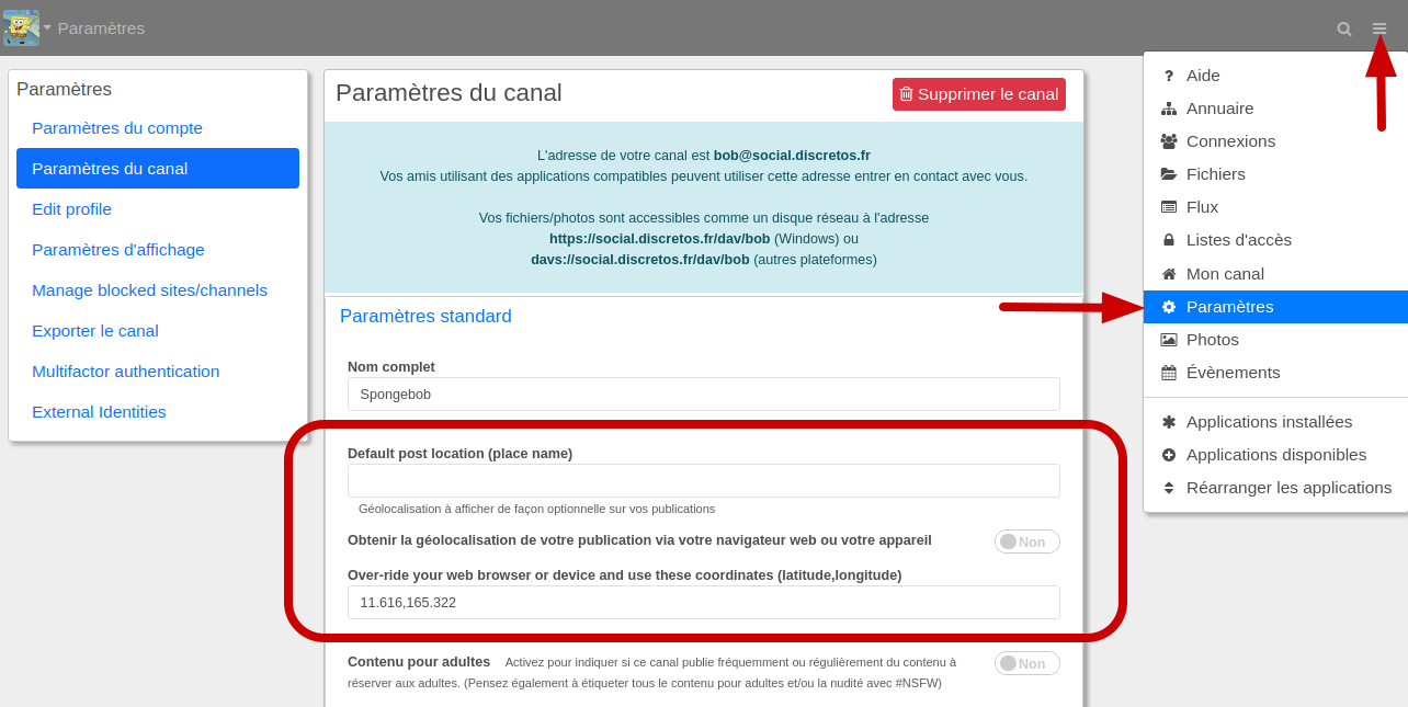 Les paramètres de géolocalisation se trouvent sur la page principale des paramètres de votre canal. Commencez par sélectionner 'Paramètres' dans le menu des applications (menu "hamburger menu" en haut à droite de la page).