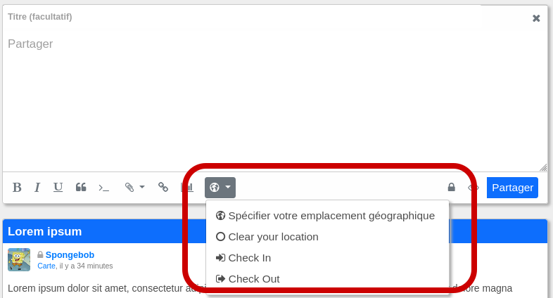 Les services de localisation disposent de plusieurs boutons dans l'éditeur de messages. Ceux-ci sont figurent sur la capture d'écran suivante: