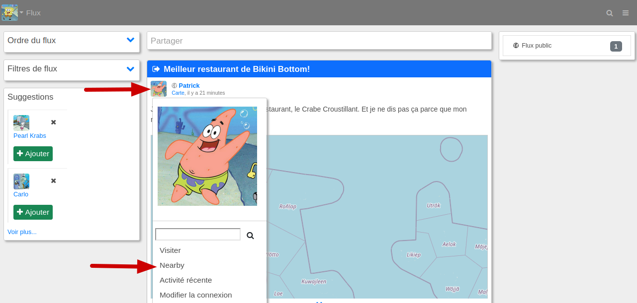 Toute publication incluant des coordonnées géographiques peut être utilisée pour effectuer une recherche à proximité. Cela vous permet de consulter rapidement (par exemple) les avis sur une zone touristique en effectuant une recherche à proximité sur tout message publié à proximité de cette zone touristique. Pour effectuer une recherche à proximité, cliquez sur l'avatar ou photo de l'auteur du message. Un mini-panneau s'ouvre alors avec un certain nombre d'options. Si le message contient des coordonnées géographiques, l'une de ces options sera "À proximité" (ou "Nearby"), ce qui permettra d'effectuer une recherche à proximité sur la base de ce message.